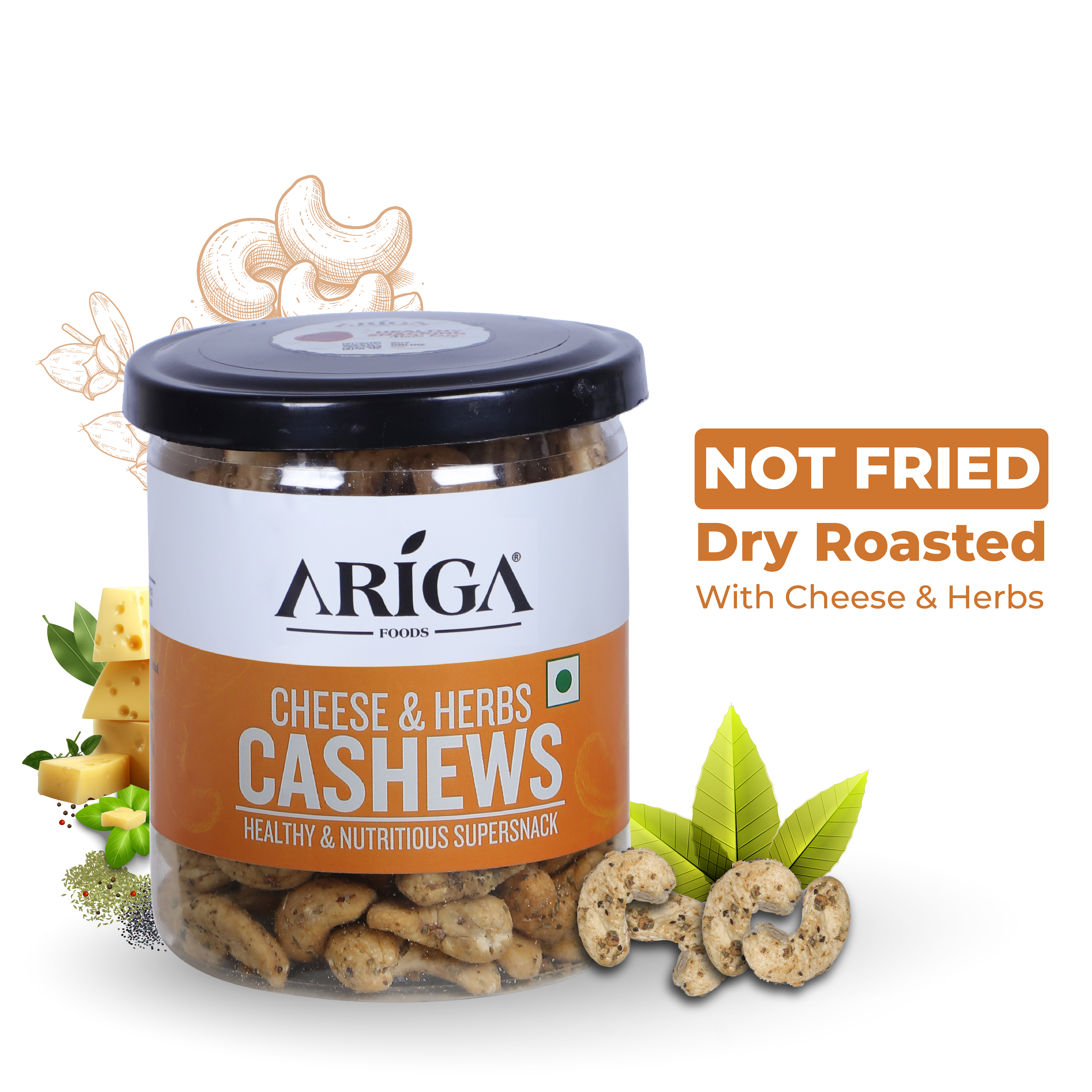 Ariga Foods premium quality roasted cashews with cheese & herbs are dry roasted with no oil. Crunchy and delicious dry fruit.