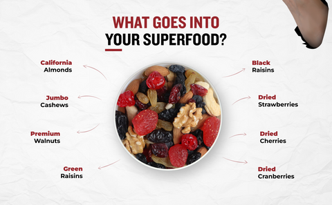 Nuts & Berries trail mix superfood is snack for adults and kids, high on antioxidants, omega-3 to increase energy levels.